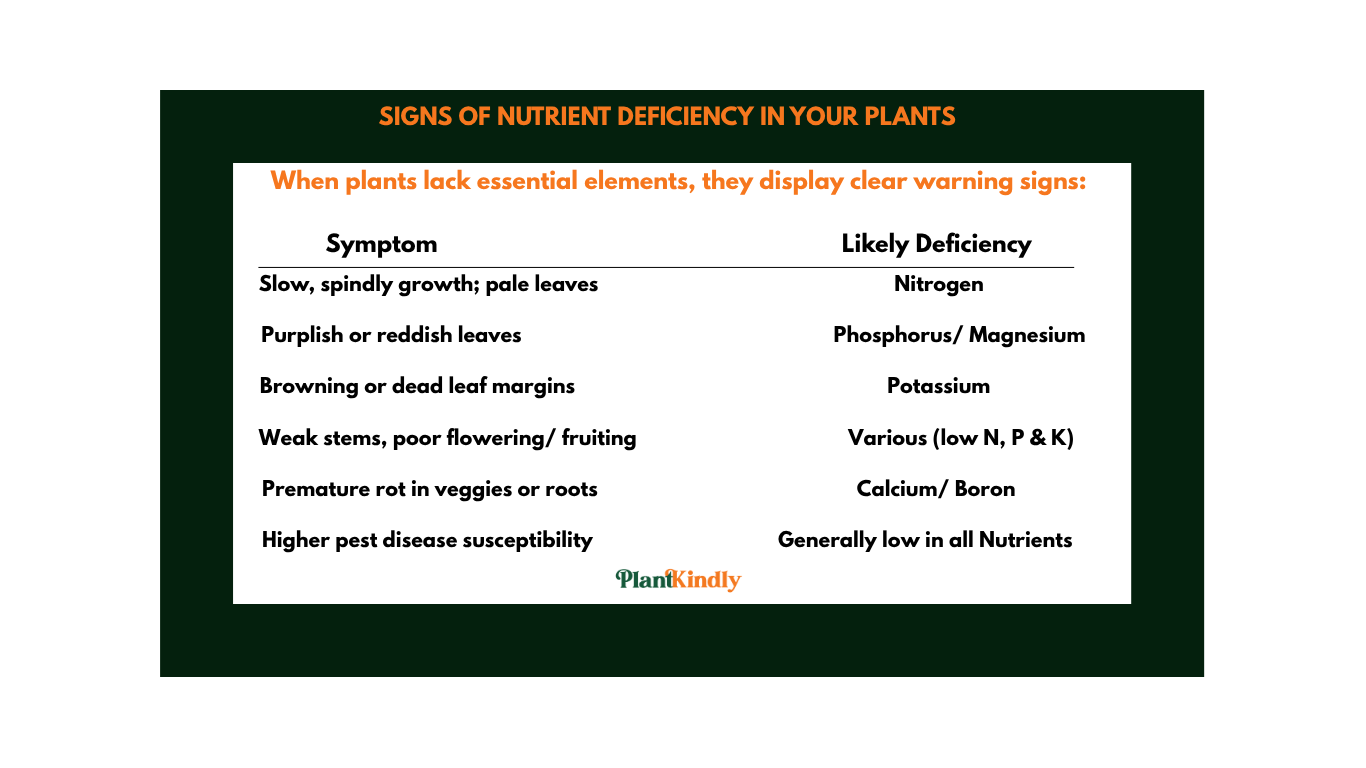 When plants are lacking key nutrients, they often "speak" through visible clues long before more serious issues arise. Below are some tips of what you can look out for and what your plant may be in need of: